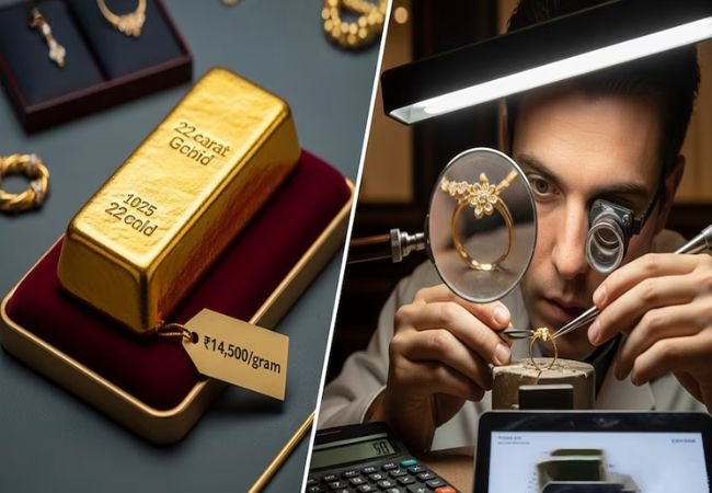 सर्वप्रथम सोन्याचा दर लक्षात घ्यावा लागतो. उदाहरणार्थ, समजा 24 कॅरेट सोन्याचा दर 6,500 रुपये प्रति ग्रॅम आहे. मात्र दागिने साधारणपणे 22 कॅरेट सोन्यात तयार केले जातात, ज्याचा दर थोडा कमी असतो. समजा 22 कॅरेट सोन्याचा दर 6,000 रुपये प्रति ग्रॅम आहे. तर 1 ग्रॅम सोन्याची बेस किंमत 6,000 रुपये धरली जाईल. यानंतर मेकिंग चार्ज जोडला जातो. (1 Gram Gold )