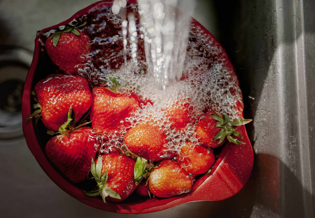 स्ट्रॉबेरी स्वच्छ करण्यासाठी एका भांड्यात १ भाग व्हाइट व्हिनेगर आणि ३ भाग पाणी घ्या. स्ट्रॉबेरीज या पाण्यात ५ ते १० मिनिटे भिजवून ठेवा. नंतर त्या स्वच्छ पाण्याने धुवून घ्या. याव्यतिरिक्त तुम्ही १ लिटर पाण्यात घेऊन त्यात १ चमचा बेकिंग सोडा मिसळा. स्ट्रॉबेरीज या पाण्यात ५ मिनिटे भिजत घाला. नंतर त्या स्वच्छ पाण्याने दोनदा धुवा. स्ट्रॉबेरी स्वच्छ करण्यासाठी मिठाचा वापर देखील केला जातो यासाठी १ लिटर पाण्यात १ चमचा मीठ घालून मिश्रण तयार करा. आता स्ट्रॉबेरीज यात ५ ते १० मिनिटे भिजत ठेवा. नंतर स्वच्छ पाण्याने धुवा. (Top Stories)